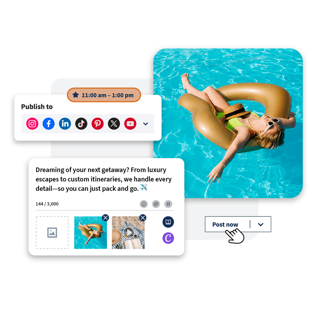 Hootsuite’s AI writing tool instantly creates captions, generates hashtags, and transforms trends into fresh posts. Plus, with Hootsuite Standard, you can create dazzling content way faster with Canva templates and free stock images — right at your fingertips.